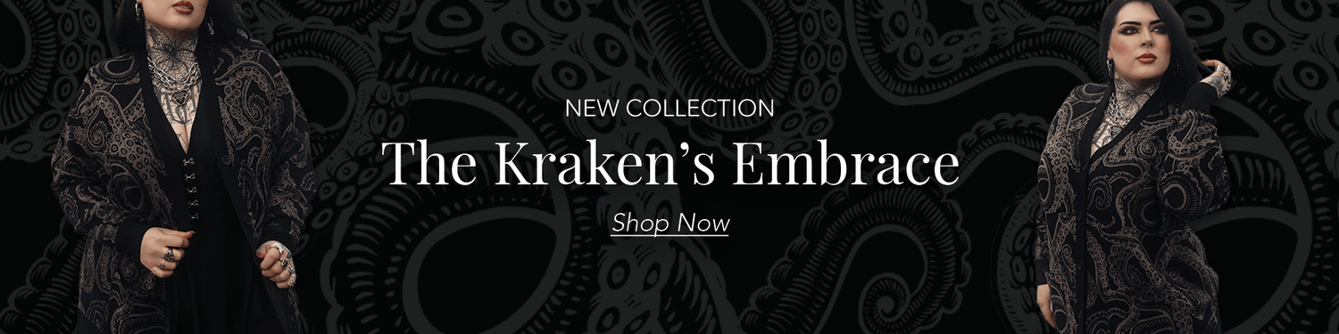 The Kraken's Embrace is here and it's pulling you under. Our new gothic alternative collection is packed with statement black dresses, wrap tops, sheer mesh and a knit cardigan unlike anything else in your wardrobe.