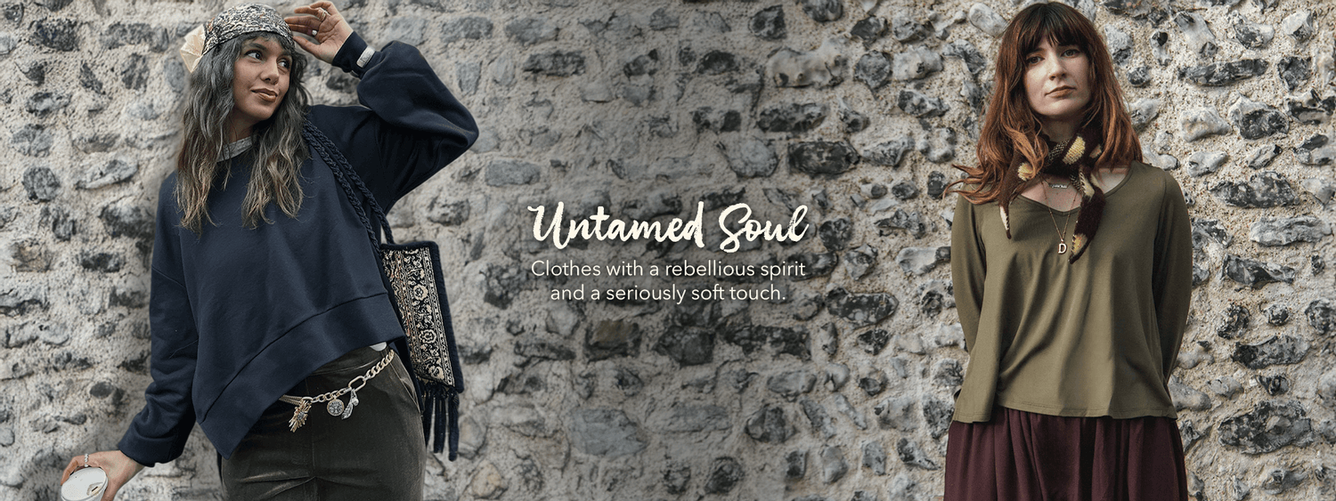 The Untamed Soul sustainable loungewear collection is your rebelliously soft style upgrade. The Bibi fleece dress delivers a classic fit-and-flare silhouette with cosy fleece lining—the ultimate winter dress with deep pockets. The Junko oversized crop jumper offers slouchy comfort with thumb holes. Prefer lighter layers? The Marsha long sleeve crop top and Claudette wide leg trousers bring boho vibes in cooling viscose.