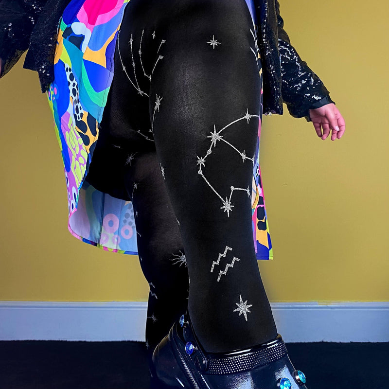 Zodiac pattern tights are a must for any Aquarius. A stunning starry constellation glitter print on a black base. They're designed to fit everybody and look great on all legs. They're comfy, stretchy and won't roll down or dig in. Just tights that really fit.
