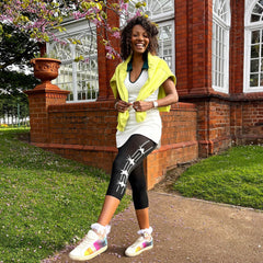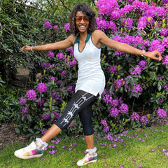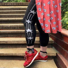 Lunar 80 denier capri tights feature a black base with a striking white star and stripe pattern along the sides. The design is knitted in, not printed on, ensuring it looks great on all sizes without warping. These are perfect for adding something special to your fits, and will stay in place all day without rolling down, digging in, or sagging. Ideal for festivals, workouts, or everyday wear!