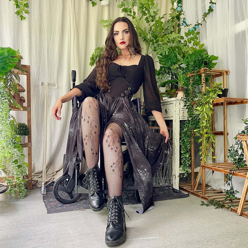 Behold Fish Upon A Star, Celestial Fishnet tights, where an intricate design of stars and swirls are knitted into yarn as dark as the night sky. It appears almost like a tattoo, as though the universe itself has marked you as its own. But these are no ordinary fishnets – they are forged from a fabric as strong and resilient as the stars, with chub rub shorts built right in, stretching with ease and oh so comfortable, while remaining steadfast against the trials of time.