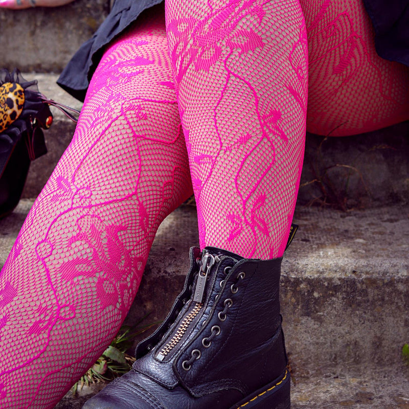 Let your legs bloom with Pomegranate, a rich, juicy pink shade for our incredible Riff Raff tights. This vibrant colour brings our new pattern of swirling leaves and vines to life, woven directly into a classic fishnet base for a bold splash of joy.