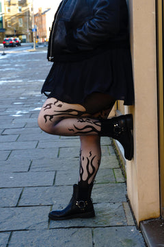Turn up the heat with Flames, our mixed denier tights that are made for burning bright, moving forward and leaving what no longer serves you in the ashes. Set on a soft mid grey base, these tights feature bold black flames licking up from the feet and flickering down from the waist, wrapping your legs in movement, energy and intention.