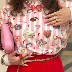 The Sweet Treat PJ Set is bedtime comfort with a sugar-rush twist. Covered in our exclusive Sweet Treat print, designed in-house by the brilliant Corina. It’s playful, joyful, and unapologetically fun. A celebration of Britain’s finest cakes and puddings all tumbling across soft pink and white candy stripes. These are the kind of PJs that make getting ready for bed feel like a treat in itself.