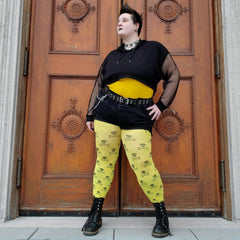 These bright yellow tights have an epic skull pattern knitted right in - great for adding a pop of colour to any gothic wardrobe. With 12 inches of multi-dimensional stretch, these designs don't warp on any size, are super comfy and really do fit.