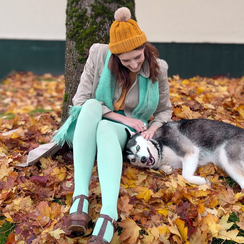 Our 120 denier opaque tights are a proper winter essential, and now in Chalcedony, a soft, pastel sage green. This shade is inspired by the calming beauty of the chalcedony gemstone and is said to bring peace and positive energy.