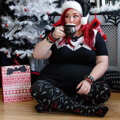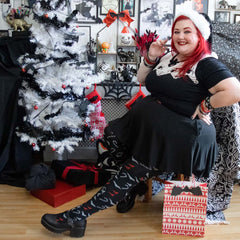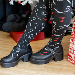 Who says Christmas has to be all sugar and spice? Not us, Bad Santa are the ultimate goth Christmas tights. With an 80-denier black base, these tights are decked out with candy canes and bats in striking red and white knitted into the base. Perfect for keeping your festive fun with a nod to the goth in you. Step into holiday spirit your way, Santa would approve!
