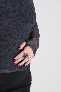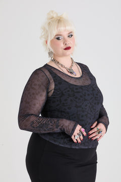 Skulls on skulls on skulls. The classic Catacomb print from our towels and cardi is now available on our best-selling mesh top. It’s the perfect blend of spooky and stylish, and it goes with pretty much everything.