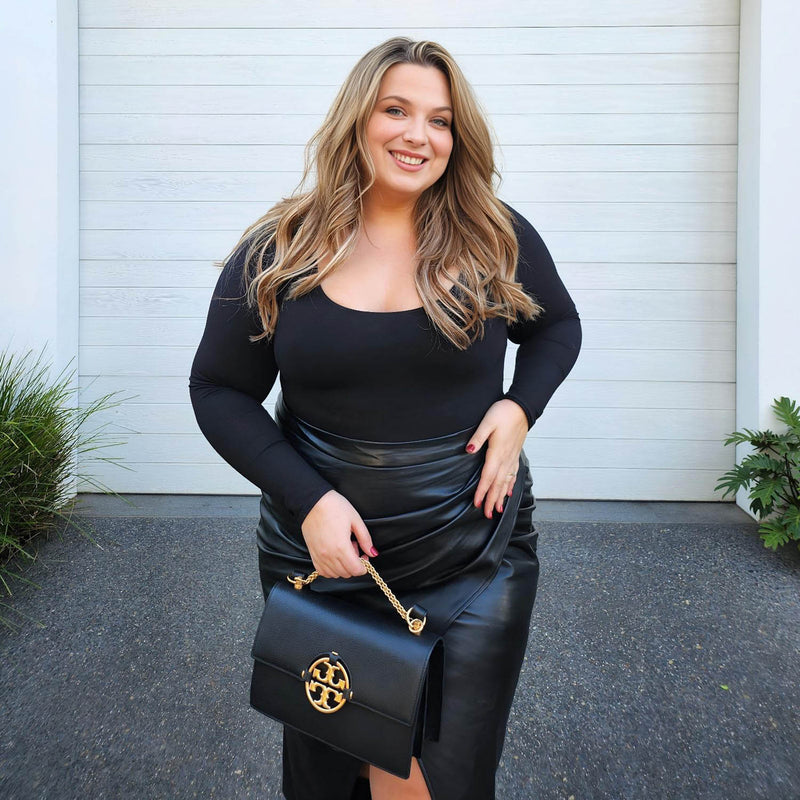 It's super stretchy, but sits against the body without cutting in, no uncomfortable underarms or thighs here. There is extra bust support built in, with an elasticated band that sits beneath the bust to give enough support that you don't need to wear a bra (but you can if you want to). This is the perfect addition to your capsule wardrobe and looks amazing with a Snag Flare Skirt, trousers and even with Dance tights for your next lesson.