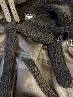 Edgy silver hardware, buckle details at the collar, a gleaming front zip and that signature metal back-neck chain give it proper rock-and-roll swagger. The deep slanted side pockets are lined in the same snuggly faux fur and ready to hold your phone, keys and lipstick. Everything you need for lift-off.