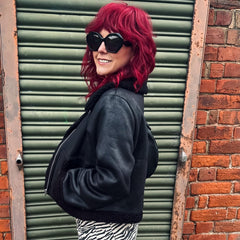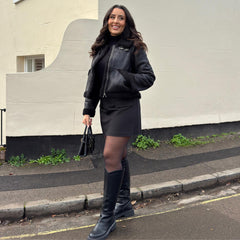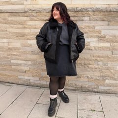 Buckle up and meet the Bessie Aviator Jacket in Black borg. This is aviator attitude wrapped in a teddy-bear hug. It is a vegan-friendly cropped jacket crafted from ultra-soft faux suede with plush borg trim on the collar and sleeve hems. Zip it up once and you are instantly wrapped in pure luxury that feels like stealing the duvet on a winter morning.