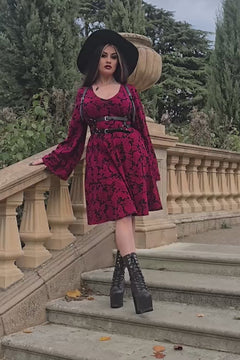 This is the Danu Dress, a piece of wearable art designed to be as comfortable as it is beautiful. It’s made from a soft, breathable cotton jersey in a stunning deep red and black print, where delicate flowers meet bold skulls. This captivating artwork is the original creation of artist and Tattooist, Sophie Bellingham.