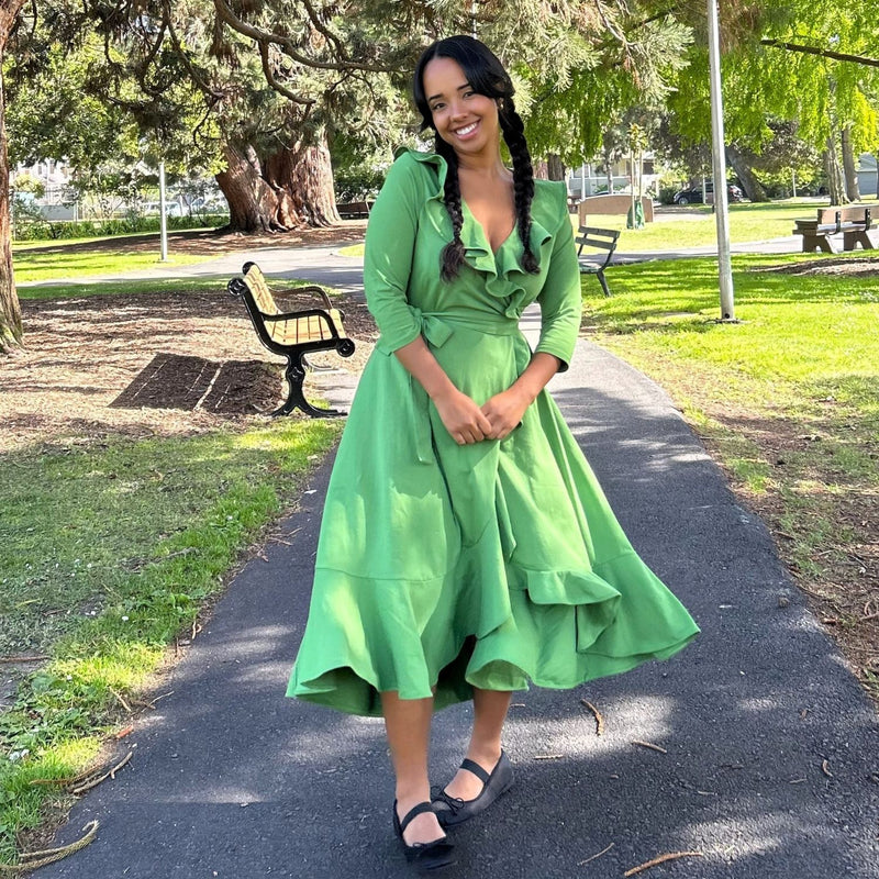 Perfect for everyday, this Meadow green Frill Wrap Dress is super soft, super comfy and as always, practical. Made from a cotton elastane blend, it's got discreet pockets you can actually use and is a true wrap with long ties to fit all bodies. The dress hits at a midi length and is finished with a frill hem and collar and 3/4 length sleeves.