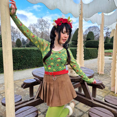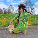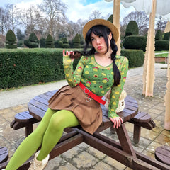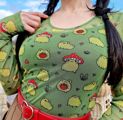 If cute frogs are your power animal, this one's for you. The Hoppy Meadow Mesh Top is set on a soft mesh base with playful green frogs dotted all over, from strawberry-hugging cuties to frogs in tiny toadstool hats. Long-sleeved, round neck, fitted silhouette. A statement that still feels easy to wear.