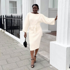 Introducing the Snag Cocoon Dress in a soft dreamy Oatmeal hue. Crafted from our signature knit fabric, this dress offers cocoon-like comfort and a flattering fit for all figures. The graceful midi length falls just below the knee, while the removable waist tie lets you transform your look in seconds! Cinch it in for a defined waist or wear it loose for a flowy, relaxed vibe.