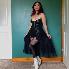 Get the look of a classic garter and stockings without any of the faff. A spooky spin on our popular Frank mock garter style, our Venom tights feature a sexy cobweb design that sits high on the thigh for a look that’s built for comfort. It’s the perfect way to add some gothic glamour to your outfit.