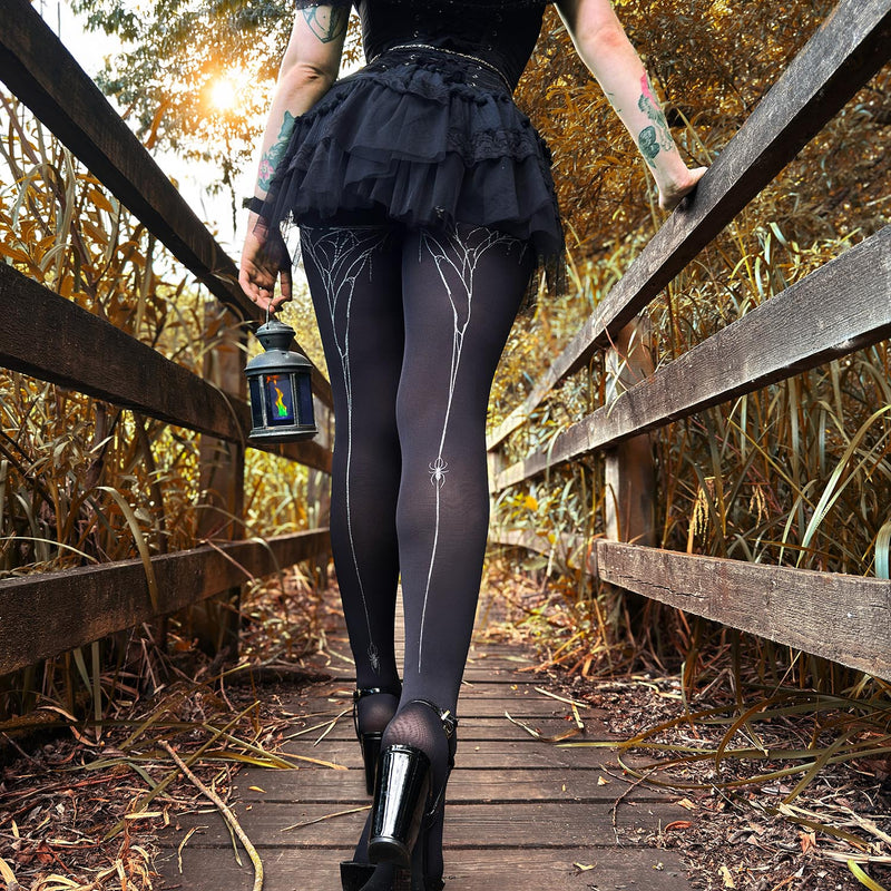 Spin a web of spooky, elegant style with our Weaver tights. These aren't just for haunted houses; a delicate silver glitter cobweb runs up the back of each leg, adding a flash of magic to your look. They're based on our super-comfy 80 denier opaque black tights, so they feel as good as they look.