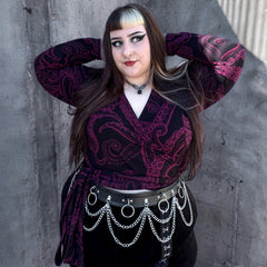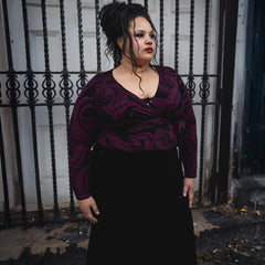 We put our bestselling wrap top in the Kraken's Embrace print and honestly, we're obsessed. Bold, flattering and dripping in alternative energy, the custom tentacle design coils across a black base in deep Cherry. It draws the eye without ever shouting.